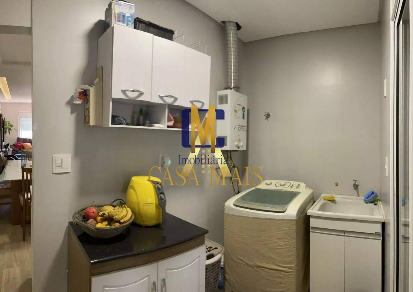 - Cozinha com móveis sob medida e mesa de jantar